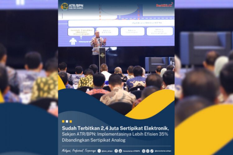 SUARA NGAWI, JAKARTA - Sejak diluncurkan pada Desember 2023 lalu, 2,4 juta Sertipikat Elektronik sudah berhasil diterbitkan dan dapat mengefisiensi hingga lebih dari 35% waktu penerbitan sertipikat tanah. Hal tersebut disampaikan Sekretaris Jenderal (Sekjen) Kementerian Agraria dan Tata Ruang/Badan Pertanahan Nasional (ATR/BPN), Suyus Windayana saat membuka Monitoring dan Evaluasi Implementasi Penerbitan Dokumen Elektronik pada Layanan Pertanahan Tahun 2024, Kamis (28/11/2024).
