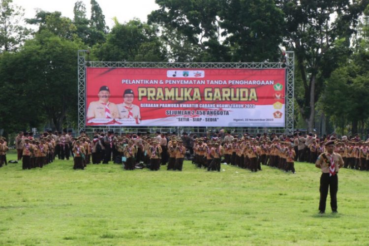 NGAWI - Bupati Ngawi Ony Anwar Harsono menyematkan tanda penghargaan kepada 2.458 peserta tahun 2023 Pramuka Garuda Kwarcab Ngawi Tahun 2023 di Alun-alun Merdeka, Rabu 22 Nopember lalu.