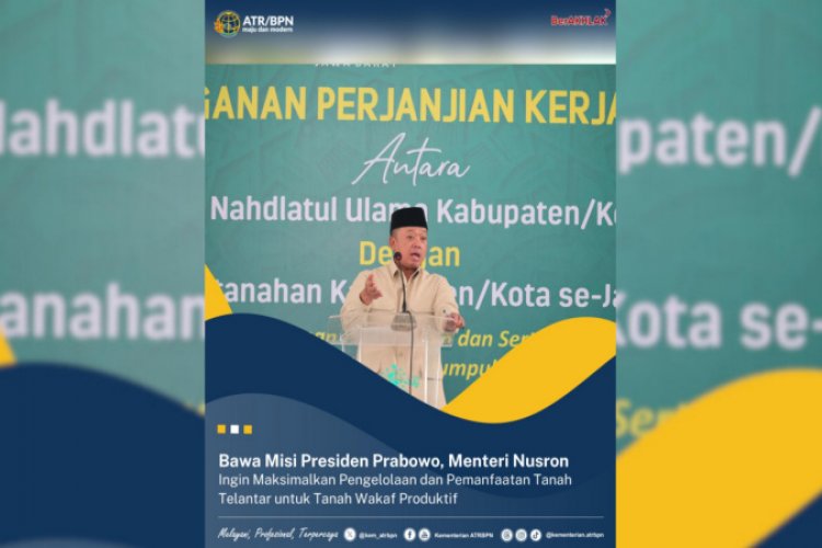 SUARA NGAWI, BANDUNG - Menteri Agraria dan Tata Ruang/Kepala Badan Pertanahan Nasional (ATR/BPN), Nusron Wahid berkomitmen membawa misi Presiden Prabowo Subianto untuk menata ulang pengelolaan dan pemanfaatan tanah di Indonesia. Hal itu akan dilakukan dengan konsep menciptakan rasa keadilan, pemerataan, dan tidak memutus mata rantai kesinambungan ekonomi. Menurutnya, salah satu upaya yang bisa dilakukan ialah dengan memaksimalkan pengelolaan dan pemanfaatan tanah telantar menjadi tanah wakaf produktif untuk kemaslahatan umat.