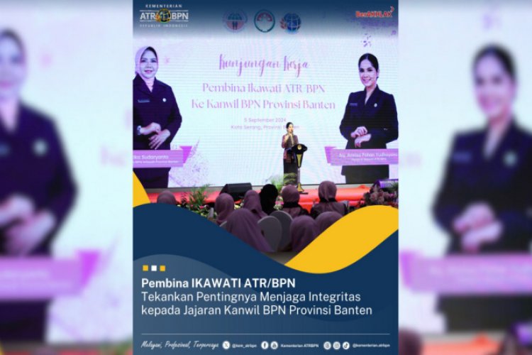 SUARA NGAWI, BANTEN - Dalam dunia kerja, tidak hanya dibutuhkan kemampuan yang baik, tetapi juga penting untuk setiap insan menjaga integritas. Demikian disampaikan Pembina Ikatan Istri Karyawan dan Karyawati Kementerian Agraria dan Tata Ruang/Badan Pertanahan Nasional (IKAWATI ATR/BPN), Annisa Pohan Yudhoyono kepada jajaran Kantor Wilayah (Kanwil) BPN Provinsi dan Kantor Pertanahan di wilayah Banten pada Kamis (05/09/2024).
