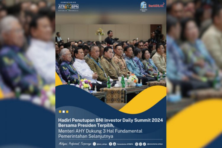 SUARA NGAWI, JAKARTA - Menteri Agraria dan Tata Ruang/Kepala Badan Pertanahan Nasional (ATR/BPN), Agus Harimurti Yudhoyono (AHY) menghadiri penutupan BNI Investor Daily Summit 2024 yang berlangsung di Assembly Hall, Jakarta Convention Centre (JCC), Rabu (09/10/2024).