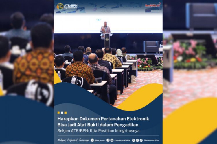 SUARA NGAWI, JAKARTA - Sekretaris Jenderal (Sekjen) Kementerian Agraria dan Tata Ruang/Badan Pertanahan Nasional (ATR/BPN), Suyus Windayana mengatakan bahwa dokumen pertanahan elektronik ke depannya dapat menjadi alat bukti dalam pengadilan. Saat membuka kegiatan Monitoring dan Evaluasi Implementasi Penerbitan Dokumen Elektronik pada Layanan Pertanahan Tahun 2024, Kamis (28/11/2024), ia mengatakan bahwa dengan sistem elektronik bisa lebih terjaga kredibilitas data pertanahannya.