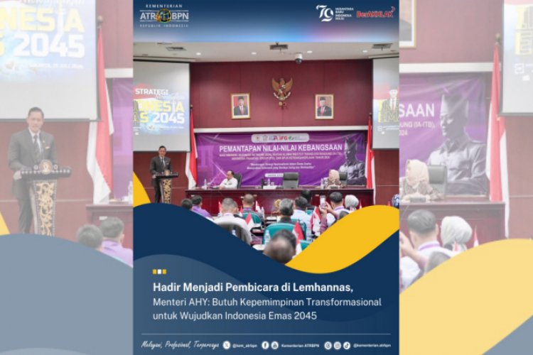 SUARA NGAWI, JAKARAT - Menteri Agraria dan Tata Ruang/Kepala Badan Pertanahan Nasional (ATR/BPN), Agus Harimurti Yudhoyono (AHY) menjadi narasumber dalam kegiatan Pemantapan Nilai-Nilai Kebangsaan di Gedung Lembaga Ketahanan Nasional (Lemhannas), Jakarta, Kamis (25/07/2024). Dalam kesempatan ini, ia menyampaikan bahwa Indonesia Emas 2045 dapat terwujud dengan menyatukan sumber daya alam dan sumber daya manusia.