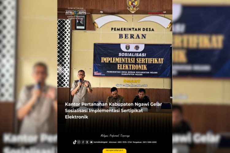 Kepala Kantor Pertanahan Kabupaten Ngawi menyampaikan bahwa implementasi sertipikat elektronik merupakan langkah strategis untuk meningkatkan efisiensi, keamanan, dan transparansi dalam administrasi pertanahan. "Dengan sertipikat elektronik, masyarakat dapat mengakses layanan secara lebih mudah, cepat, dan aman, sejalan dengan perkembangan teknologi saat ini," ujarnya.