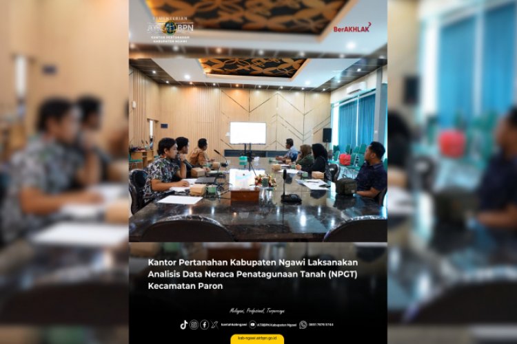 NGAWI - Pada hari Jumat, Seksi Penataan dan Pemberdayaan Kantor Pertanahan Kabupaten Ngawi menyelenggarakan kegiatan Analisis Data Neraca Penatagunaan Tanah untuk Kecamatan Paron. Kegiatan ini bertempat di Ruang Sanggraha Kantor Pertanahan Kabupaten Ngawi dan dihadiri langsung oleh Camat Paron beserta tim teknis.