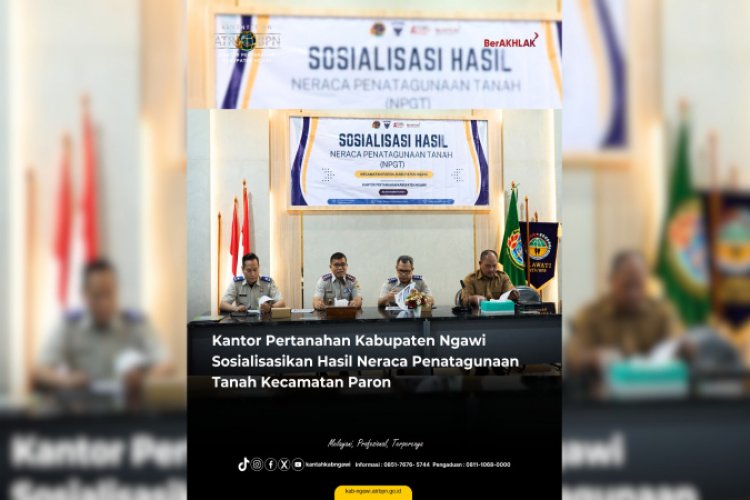 NGAWI - Selasa, 26 November 2024, Seksi Penataan dan Pemberdayaan Kantor Pertanahan Kabupaten Ngawi melaksanakan Sosialisasi Hasil Neraca Penatagunaan Tanah Kecamatan Paron. Kegiatan ini bertempat di ruang Sanggraha, dengan dihadiri oleh sejumlah pejabat dan pemangku kepentingan terkait.
