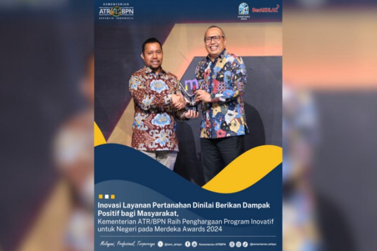 SUARA NGAWI, JAKARTA - Kementerian Agraria dan Tata Ruang/Badan Pertanahan Nasional (ATR/BPN) meraih penghargaan pada Merdeka Awards 2024 dalam kategori Program Inovatif untuk Negeri. Penghargaan diterima langsung oleh Sekretaris Jenderal Kementerian ATR/BPN, Suyus Windayana yang dalam hal ini mewakili Menteri ATR/Kepala BPN, Agus Harimurti Yudhoyono (AHY) di Auditorium SCTV Tower, Jakarta, Kamis (19/09/2024).