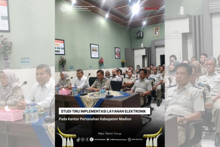 NGAWI - Kepala Kantor Pertanahan Kabupaten Ngawi Bapak Dekasius Sulle, A.Ptnh., M.T. beserta Kepala Subbagian Tata Usaha, Pejabat Pengawas, dan Petugas Pelaksana melaksanakan studi tiru Implementasi Layanan Elektronik Pada Kantor Pertanahan Kabupaten Madiun.
