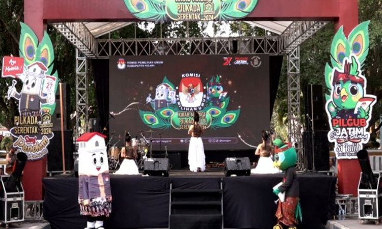 NGAWI - Komisi Pemilihan Umum (KPU) Ngawi terima Kirab Maskot Pilkada Serentak 2024 dari KPU Bojonegoro, pada Selasa (03/09/24) di Jalan Tengah, Alun-Alun Merdeka, Ngawi.