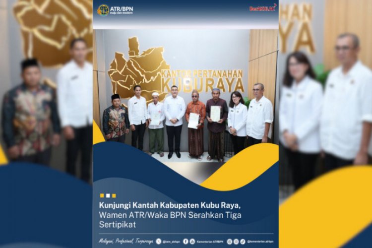 "Saya selaku Wamen ATR/Waka BPN, sangat senang dan berbahagia bisa tiba di Kabupaten Kubu Raya dan bertemu dengan Bapak-bapak. Bisa menyerahkan sertipikat, baik untuk masjid maupun untuk pesantren yang Bapak pimpin. Mudah-mudahan dengan adanya sertipikat ini maka keabsahan legalitas dari tanah yang dimiliki, baik untuk masjid maupun pesantren sudah memiliki kepastian hukum," ucap Ossy Dermawan saat menyerahkan sertipikat dalam kunjungannya ke Kantor Pertanahan (Kantah) Kabupaten Kubu Raya.