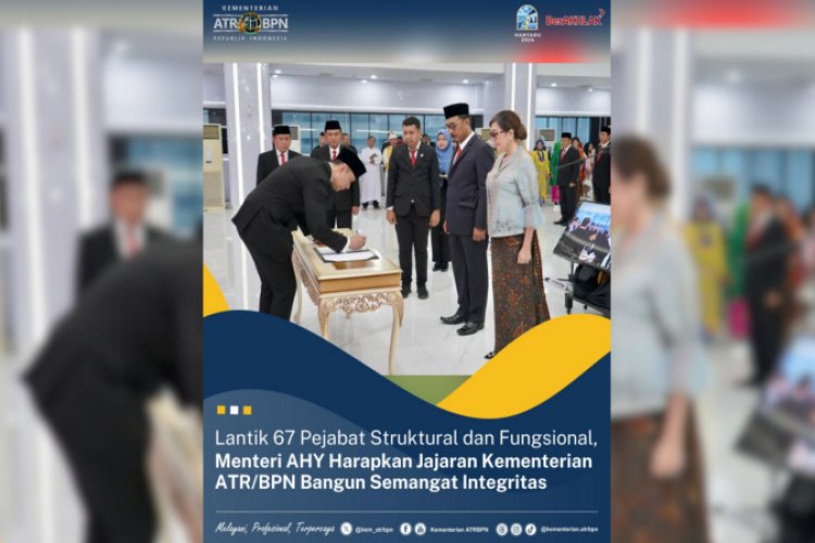 SUARA NGAWI, JAKARTA - Menteri Agraria dan Tata Ruang/Kepala Badan Pertanahan Nasional (ATR/BPN), Agus Harimurti Yudhoyono (AHY) melantik 67 pejabat di lingkungan Kementerian ATR/BPN yang terdiri dari Pejabat Pimpinan Tinggi Madya dan Pratama serta Pejabat Administrator dan Fungsional. Pelantikan sekaligus Pengambilan Sumpah/Janji Jabatan Pejabat Struktural dan Fungsional ini berlangsung di Aula Prona, Kantor Kementerian ATR/BPN, Jakarta, Senin (14/10/2024).