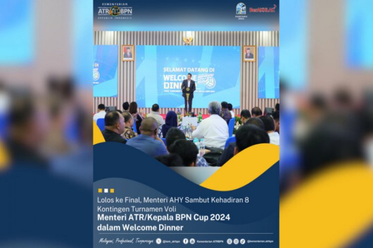 SUARA NGAWI, JAKARTA - Menteri Agraria dan Tata Ruang/Kepala Badan Pertanahan Nasional (ATR/BPN), Agus Harimurti Yudhoyono (AHY) menyambut hadirnya delapan kontingen yang berhasil lolos ke putaran final Turnamen Voli Menteri ATR/Kepala BPN Cup 2024 dalam Welcome Dinner di Kementerian ATR/BPN, Jakarta, Selasa (17/09/2024). Ia berharap, Turnamen Voli ini dapat ikut memajukan semangat olahraga di Indonesia, khususnya olahraga voli.