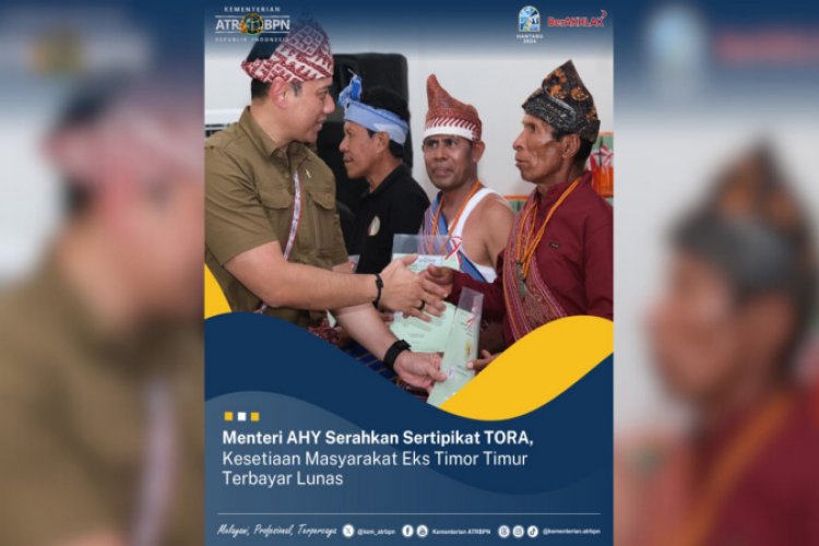 SUARA NGAWI, KUPANG - Menteri Agraria dan Tata Ruang/Kepala Badan Pertanahan Nasional (ATR/BPN), Agus Harimurti Yudhoyono (AHY) menyerahkan sertipikat bagi Tanah Objek Reforma Agraria (TORA) kepada masyarakat eks Timor-Timur di Desa Oebola Dalam, Kecamatan Fatuleu, Kabupaten Kupang, Provinsi Nusa Tenggara Timur (NTT), Sabtu (14/09/2024) sore.