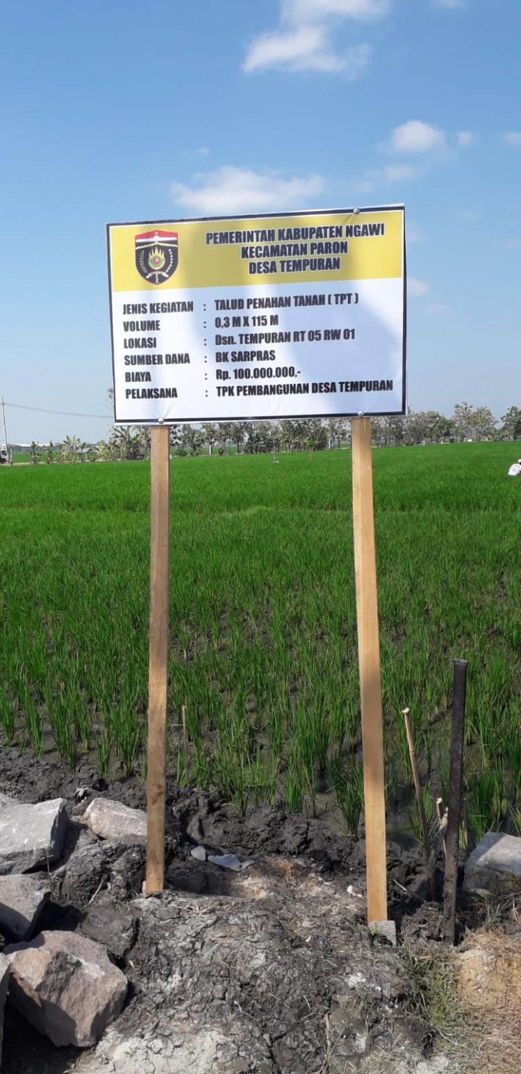 Seperti yang dilaksanakan di Dusun Tempuran RT 05/ RW 01 membangun talut penahan tanah (tpt) dengan volume 0,3 meter x 115 meter.