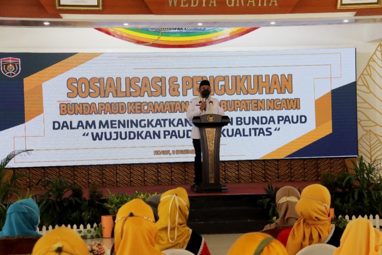 NGAWI - Di Pendopo Wedya Graha, Bupati Ngawi Ony Anwar telah mengukuhkan puluhan bunda Pendidikan Anak Usia Dini (PAUD) yang ada di seluruh kecamatan di Kabupaten Ngawi pada, Rabu (8/12/2021).
