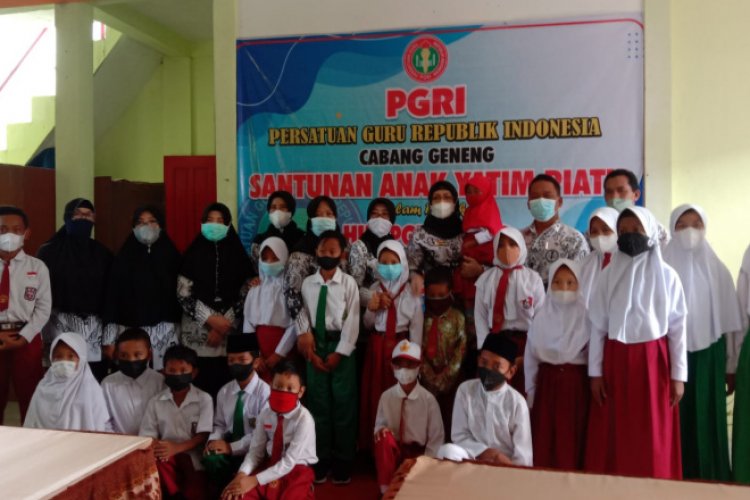 NGAWI - Dalam rangka Hari Persatuan Guru Republik Indonesia (PGRI) yang ke 76, dan dalam rangka memperingati Hari Guru tahun 2021. Pengurus PGRI Kecamatan Geneng, Kabupaten Ngawi, Jawa Timur, menggelar kegiatan sosial yakni memberikan santunan kepada puluhan pelajar anak yatim.