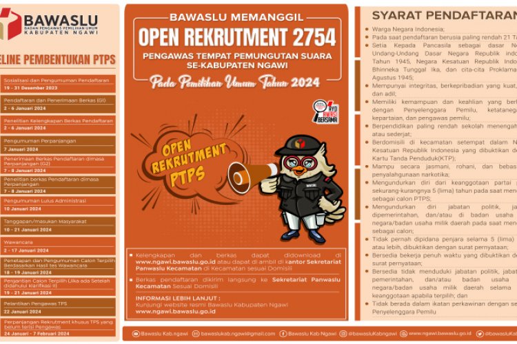 NGAWI - Badan Pengawas Pemilihan Umum (Bawaslu) Kabupaten Ngawi telah mengumumkan jadwal pendaftaran Pengawas Tempat Pemungutan Suara (PTPS) untuk Pemilu 2024 mendatang.