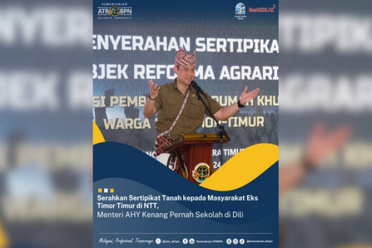 SUARA NGAWI, KUPANG - Menteri Agraria dan Tata Ruang/Kepala Badan Pertanahan Nasional (ATR/BPN), Agus Harimurti Yudhoyono (AHY) menyerahkan sertipikat hasil dari program Redistribusi Tanah kepada masyarakat eks Timor Timur di Desa Oebola Dalam, Kecamatan Fatuleu, Kabupaten Kupang, Provinsi Nusa Tenggara Timur (NTT) pada Sabtu (14/08/2024). Dalam momen ini, ia pun teringat akan kenangan masa lalunya yang pernah menjadi bagian dari Timor Timur.
