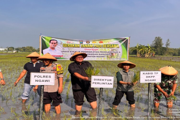 NGAWI - Dinas Ketahanan Pangan dan Pertanian (DKPP) Kabupaten Ngawi melalui Bidang Tanaman Pangan bersama Direktur Perlindungan Tanaman Pangan Ditjen Tanaman Pangan Kementan RI, Dr. Rachmat, S.Si, M.Si dan jajarannya melaksanakan gerakan tanam padi bersama.