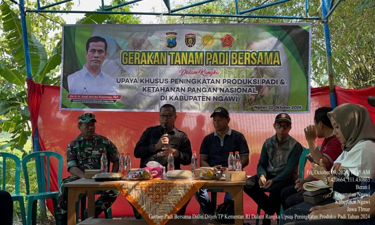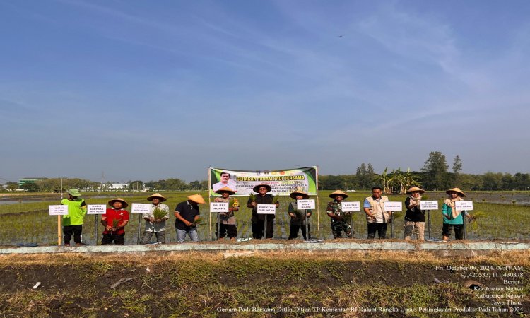 Pelaksanaan gerakan tanam padi yang dilaksanakan di Desa Beran, Kecamatan Ngawi, Kabupaten Ngawi pada (11/10/2024), dalam rangka upaya peningkatan produksi padi dan ketahanan pangan nasional.