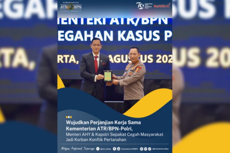 SUARA NGAWI, JAKARTA - Kementerian Agraria dan Tata Ruang/Badan Pertanahan Nasional (ATR/BPN) dan Kepolisian Republik Indonesia (Polri) sepakat untuk bekerja sama mencegah terjadinya konflik pertanahan. Menteri ATR/Kepala BPN, Agus Harimurti Yudhoyono (AHY) menyebut kerja sama yang mengutamakan pencegahan konflik ini dilakukan guna menuntaskan kejahatan pertanahan.