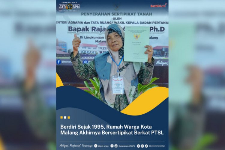 SUARA NGAWI, KOTA MALANG - Manfaat Program Pendaftaran Tanah Sistematis Lengkap (PTSL) yang dijalankan Kementerian Agraria dan Tata Ruang/Badan Pertanahan Nasional (ATR/BPN) semakin banyak dirasakan oleh masyarakat. Salah satunya, Hartining (67) warga Kelurahan Polehan, Kota Malang yang secara nyata terbantu dengan PTSL dan memudahkannya memiliki sertipikat atas tanah yang ia beli pada tahun 1995.