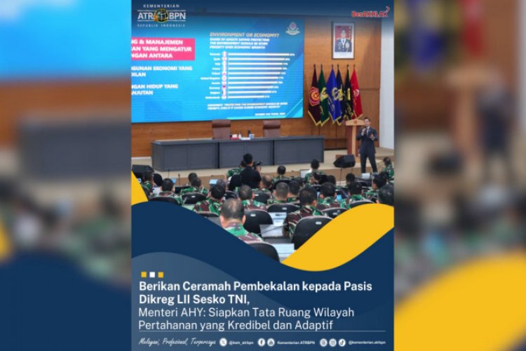 SUARA NGAWI, BANDUNG - Menteri Agraria dan Tata Ruang/Kepala Badan Pertanahan Nasional (ATR/BPN), Agus Harimurti Yudhoyono (AHY) memberikan ceramah pembekalan kepada Pasis Dikreg LII Sesko TNI, di Gedung Graha Widya Adibrata Sesko TNI, Bandung, Jumat (06/09/2024). Dalam kesempatan ini, ia berbicara mengenai pertanahan dan pertahanan negara, khususnya terkait tata ruang wilayah pertanahan untuk mendukung ketahanan dan kedaulatan negara.
