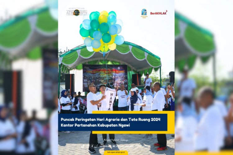 NGAWI - Kantor Pertanahan Kabupaten Ngawi melaksanakan kegiatan puncak peringatan Hari Agraria dan Tata Ruang Tahun 2024 di halaman Kantor Pertanahan Kabupaten Ngawi. Acara puncak ini ditandai dengan simbolis pelepasan balon oleh Bapak Muhammad Nurwathoni, A.Ptnh,. Pelepasan balon ini melambangkan harapan dan komitmen bersama dalam meningkatkan pengelolaan sumber daya agraria dan penataan ruang yang lebih baik di daerah.