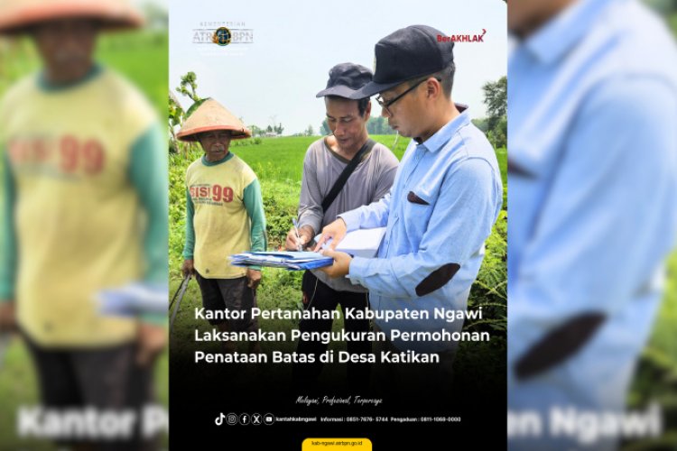 NGAWI - Petugas Ukur Kantor Pertanahan Kabupaten Ngawi telah melaksanakan pengukuran rutin untuk permohonan penataan batas di Desa Katikan, Kecamatan Kedunggalar, pada Jumat, 15 November 2024. Kegiatan ini merupakan bagian dari pelayanan pertanahan kepada masyarakat dalam rangka memastikan kejelasan dan legalitas batas-batas tanah.