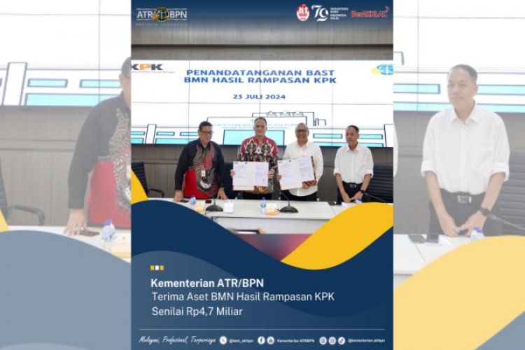 SUARA NGAWI, JAKARTA - Kementerian Agraria dan Tata Ruang/Badan Pertanahan Nasional (ATR/BPN) terima aset Barang Milik Negara (BMN) hasil rampasan Komisi Pemberantasan Korupsi (KPK) dengan total nilai Rp4,78 miliar. Penyerahan ditandai dengan penandatangan Berita Acara Serah Terima (BAST) oleh Sekretaris Jenderal (Sekjen) Kementerian ATR/BPN, Suyus Windayana dan Direktur Pelacakan Aset, Pengelolaan Barang Bukti, dan Eksekusi KPK, Mungki Hadipratikto pada Selasa (23/07/2024).