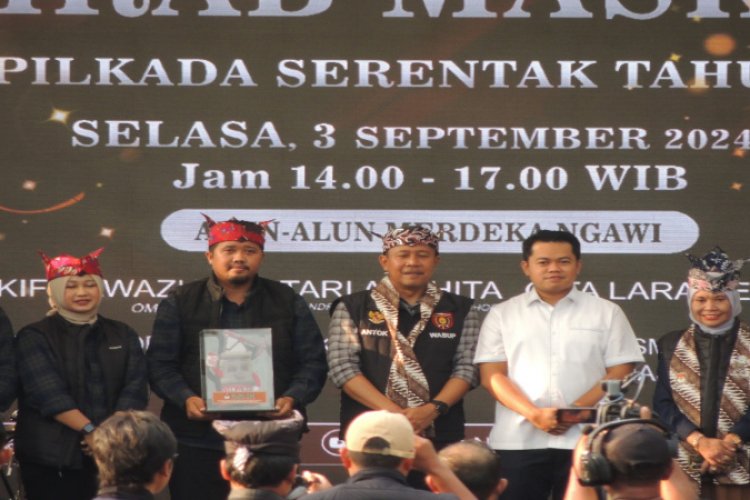 NGAWI - Komisi Pemilihan Umum (KPU) Ngawi terima Kirab Maskot Pilkada Serentak 2024 dari KPU Bojonegoro, pada Selasa (03/09/24) di Jalan Tengah, Alun-Alun Merdeka, Ngawi.