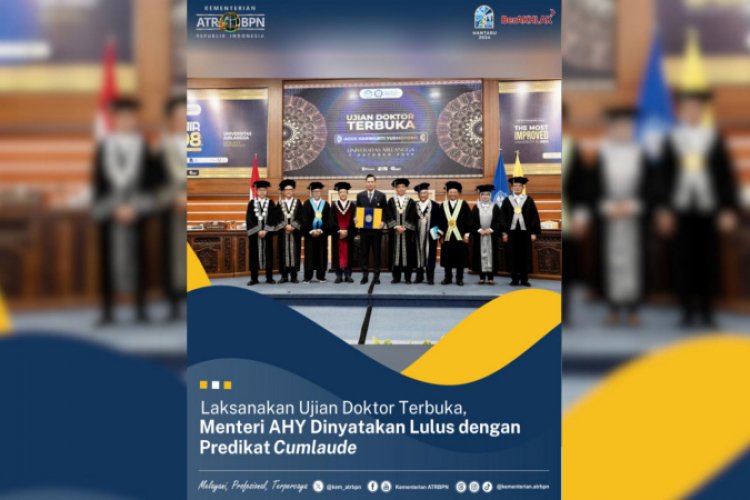 SUARA NGAWI, SURABAYA - Menteri Agraria dan Tata Ruang/Kepala Badan Pertanahan Nasional (ATR/BPN), Agus Harimurti Yudhoyono (AHY) resmi menyelesaikan studi Doktoralnya setelah melaksanakan Ujian Doktor Terbuka dan dinyatakan lulus dengan predikat Cumlaude pada Senin (07/10/2024). Ujian Doktor Terbuka yang berlangsung di Aula Garuda Mukti, Gedung Kantor Manajemen MERR C Mulyorejo, Universitas Airlangga, Surabaya ini dipimpin oleh Rektor Universitas Airlangga, Prof. Dr. Moh. Nasih, SE, MT, Ak.