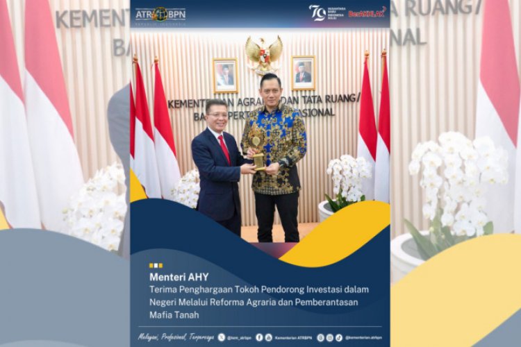 SUARA NGAWI, JAKARTA - Menteri Agraria dan Tata Ruang/Kepala Badan Pertanahan Nasional (ATR/BPN), Agus Harimurti Yudhoyono (AHY) menerima penghargaan sebagai Tokoh Pendorong Investasi dalam Negeri Melalui Reforma Agraria dan Pemberantasan Mafia Tanah. Penghargaan dari ajang Indonesia Property&Bank Award ke-18 dan Indonesia Myhome Award ke-7 ini diserahkan secara langsung kepada Menteri AHY di Kantor Kementerian ATR/BPN, Jakarta, Rabu (10/07/2024).