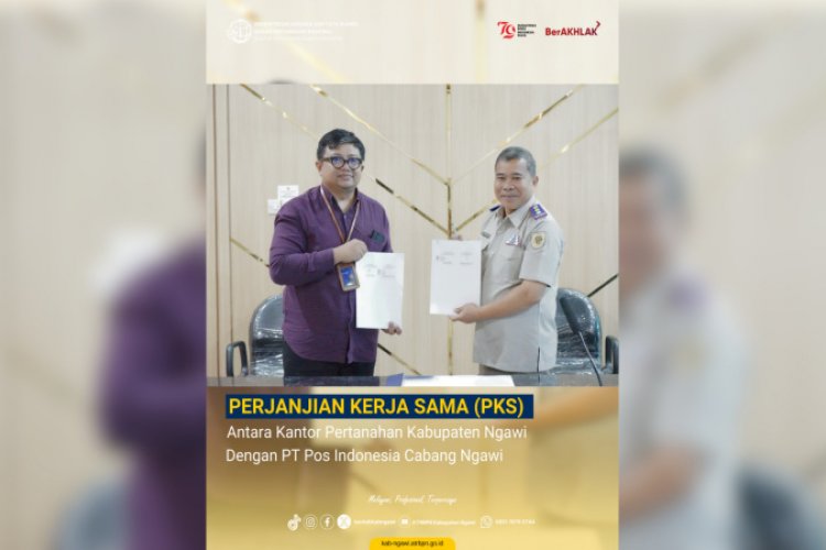 NGAWI - Pada Senin 6 Agustus 2024 lalu, kantor Pertanahan Kabupaten Ngawi menggelar penandatanganan Perjanjian Kerja Sama (PKS) dengan PT POS Indonesia Cabang Ngawi terkait pemanfaatan layanan POS Indonesia.