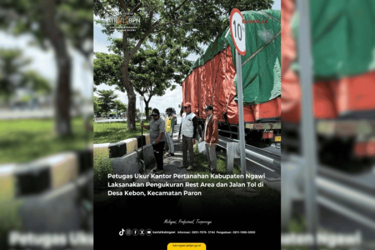 NGAWI - Sebagai bagian dari komitmen untuk mendukung pembangunan infrastruktur strategis, Petugas Ukur Kantor Pertanahan Kabupaten Ngawi melaksanakan pelayanan pengukuran terhadap rest area dan jalan tol yang berlokasi di Desa Kebon, Kecamatan Paron.