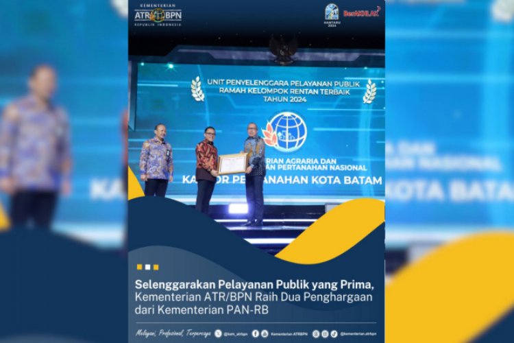 SUARA NGAWI, JAKARTA - Kementerian Agraria dan Tata Ruang/Badan Pertanahan Nasional (ATR/BPN) terus berupaya meningkatkan kualitas pelayanan publik. Upaya itu bahkan tak jarang menghasilkan sebuah penghargaan. Dalam hal ini, Kementerian ATR/BPN melalui Kantor Pertanahan (Kantah) Kota Bandar Lampung dan Kota Batam meraih penghargaan dari Kementerian Pendayagunaan Aparatur Negara dan Reformasi Birokrasi (PAN-RB) dalam acara Gebyar Pelayanan Prima yang berlangsung di Sheraton Grand Jakarta Gandaria City Hotel, Selasa (08/10/2024).