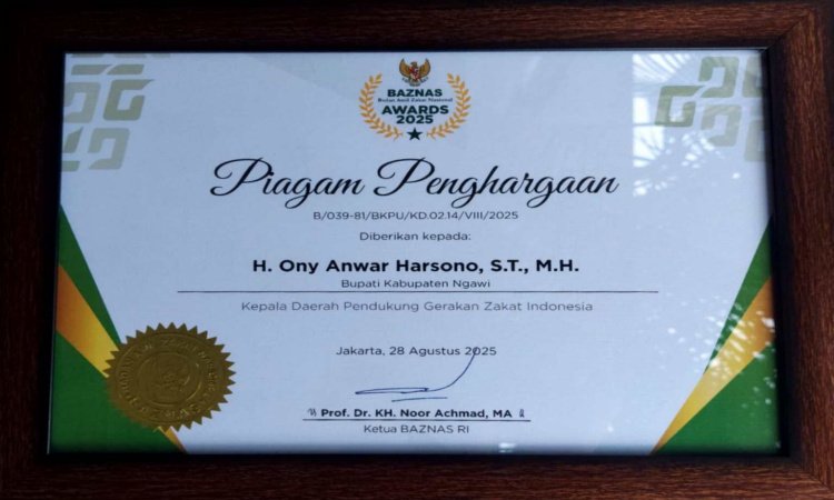 Penghargaan BAZNAS Award 2025 kategori Pengelolaan SDM terbaik itu, diserahkan secara langsung dari BAZNAS RI kepada Bupati Ngawi Ony Anwar Harsono dan Kepala Baznas Ngawi, Samsul Hadi dalam Rakornas Baznas di Jakarta pada 26-29 Agustus 2025 lalu.
