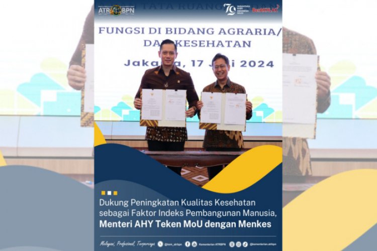 SUARA NGAWI, JAKARTA - Menteri Agraria dan Tata Ruang/Kepala Badan Pertanahan Nasional (ATR/BPN), Agus Harimurti Yudhoyono (AHY) bersama Menteri Kesehatan (Menkes), Budi Gunadi Sadikin menandatangani Nota Kesepahaman/MoU tentang Sinergi Tugas dan Fungsi di Bidang Agraria/Pertanahan, Tata Ruang, dan Kesehatan, pada Rabu (17/07/2024). Melalui kerja sama yang terjalin, Kementerian ATR/BPN turut berperan meningkatkan kualitas kesehatan masyarakat sebagai indeks pembangunan manusia di Indonesia.