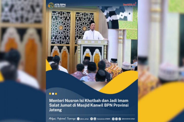 SUARA NGAWI, SEMARANG - Menteri Agraria dan Tata Ruang/Kepala Badan Pertanahan Nasional (ATR/BPN), Nusron Wahid mengisi khotbah dan menjadi imam Salat Jumat, di Masjid Ar-Ridha yang berlokasi di Kantor Wilayah (Kanwil) BPN Provinsi Jawa Tengah, Semarang, (01/11/2024).